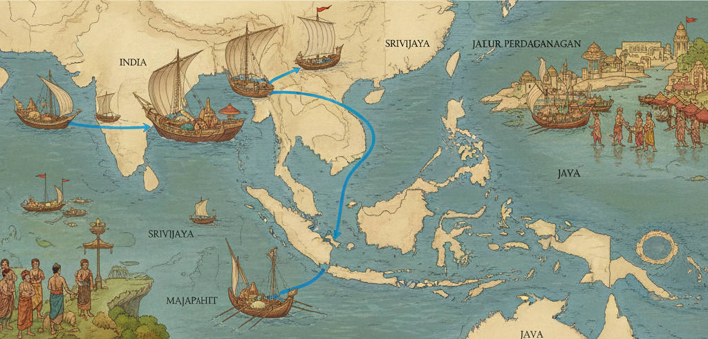 • Rute Utama: Selat Malaka berperan sebagai “pintu gerbang” yang vital. Pedagang dari India melalui Teluk Benggala, singgah di pusat-pusat niaga di Sumatra (seperti Sriwijaya) atau Jawa, sebelum melanjutkan ke Tiongkok. Bukti arkeologi menunjukkan arca Buddha dari India ditemukan di Sempaga, Sulawesi Selatan.