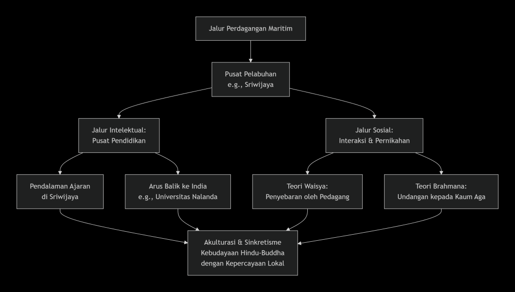 Catatan untuk Pembelajaran: Teori Sudra (kaum budak) juga pernah diajukan, tetapi dianggap paling lemah karena kelompok ini tidak memiliki pengetahuan keagamaan yang memadai. Dalam pengajaran, penting untuk menekankan bahwa kemungkinan besar penyebaran terjadi melalui kombinasi beberapa teori, bukan hanya satu. Teori Waisya menjelaskan kontak awal, teori Brahmana menjelaskan institusionalisasi agama, dan teori Arus Balik menjelaskan pendalaman dan penyebaran lanjutan.