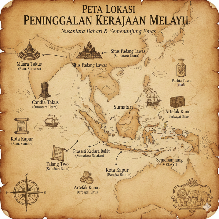 Peninggalan Kerajaan Melayu tersebar di berbagai wilayah, mencerminkan kompleksitas dan rentang waktu keberadaannya. Peninggalan ini tidak hanya berupa artefak fisik, tetapi juga tradisi lisan, sistem pemerintahan, dan jejak-jejak kebudayaan yang masih dapat kita saksikan hingga kini.