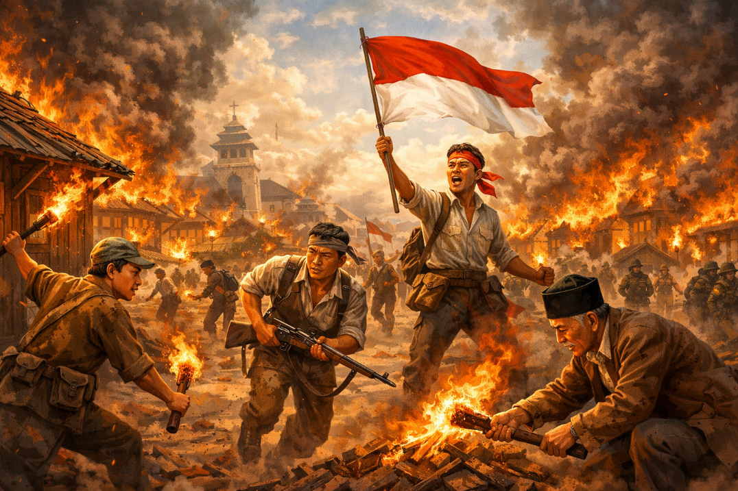 Bandung Lautan Api, atau yang dikenal secara resmi sebagai Peristiwa Bandung Lautan Api, merupakan salah satu episode paling dramatis dan heroik dalam sejarah Revolusi Kemerdekaan Indonesia. Peristiwa ini terjadi pada 23-24 Maret 1946 di Kota Bandung, Jawa Barat, ketika ribuan pejuang dan rakyat Indonesia secara sengaja membakar sebagian besar wilayah selatan kota mereka sendiri sebagai bentuk strategi “bumi hangus”. Tujuannya adalah mencegah pasukan Sekutu (Inggris) dan NICA (Netherlands Indies Civil Administration) dari Belanda untuk menjadikan Bandung sebagai basis militer yang kuat dalam upaya mereka mengembalikan kekuasaan kolonial pasca-kekalahan Jepang dalam Perang Dunia II. Di tengah euforia Proklamasi Kemerdekaan 17 Agustus 1945 yang masih segar, Bandung yang dulu dikenal sebagai kota yang indah dan modern berubah menjadi lautan api yang menyala-nyala selama berhari-hari, simbol perlawanan total yang tak kenal kompromi. Kemenangan moral yang diraih dari peristiwa ini tidak hanya menghambat kemajuan pasukan kolonial, tetapi juga membakar semangat nasionalisme di seluruh nusantara, menginspirasi lagu perjuangan legendaris “Halo-Halo Bandung” karya Ismail Marzuki, dan menjadi bukti nyata bahwa bangsa Indonesia siap berkorban segalanya demi mempertahankan kedaulatan yang baru diraih.