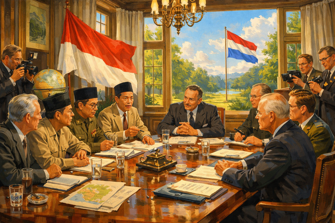 Ilustrasi suasana meja perundingan Indonesia-Belanda pada masa itu, mencerminkan ketegangan di Hooge Veluwe.