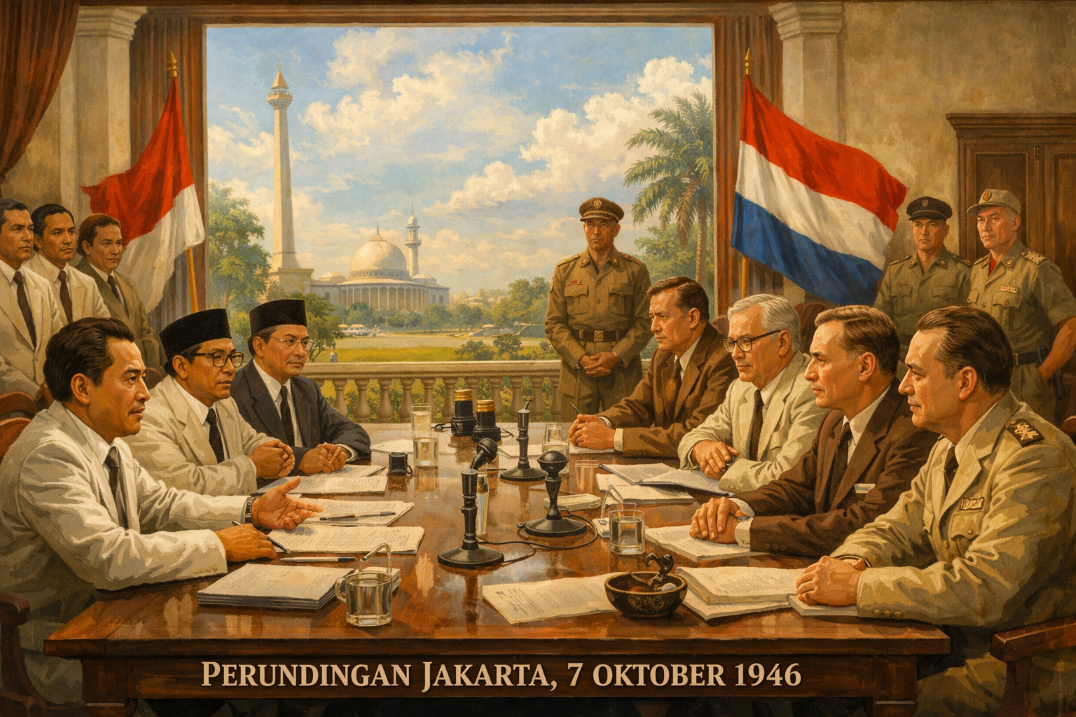 Pasca-Proklamasi Kemerdekaan 17 Agustus 1945, Indonesia menghadapi tantangan besar dari Belanda yang berusaha mengembalikan kekuasaan kolonial melalui agresi militer dan blokade ekonomi. Setelah perundingan sebelumnya seperti Hooge Veluwe (April 1946) menemui kegagalan, ketegangan semakin memuncak dengan pertempuran sporadis di berbagai wilayah. Pada akhir Agustus 1946, pemerintah Inggris, yang masih bertanggung jawab atas wilayah Hindia Belanda pasca-penyerahan Jepang, mengirimkan Lord Killearn (Sir Miles Lampson) sebagai utusan khusus untuk menengahi konflik antara Republik Indonesia dan Belanda. Perundingan Jakarta dimulai pada 7 Oktober 1946 sebagai upaya diplomasi untuk meredakan situasi perang dan membuka jalan bagi negosiasi politik yang lebih substansial. Perundingan ini bersifat pendahuluan, difasilitasi oleh Lord Killearn, dan menjadi langkah krusial dalam perjuangan diplomasi Indonesia yang dipimpin oleh Perdana Menteri Sutan Sjahrir. Meskipun belum menghasilkan pengakuan kedaulatan penuh, pertemuan ini berhasil menciptakan gencatan senjata sementara dan membuka pintu bagi Perundingan Linggarjati yang ikonik.