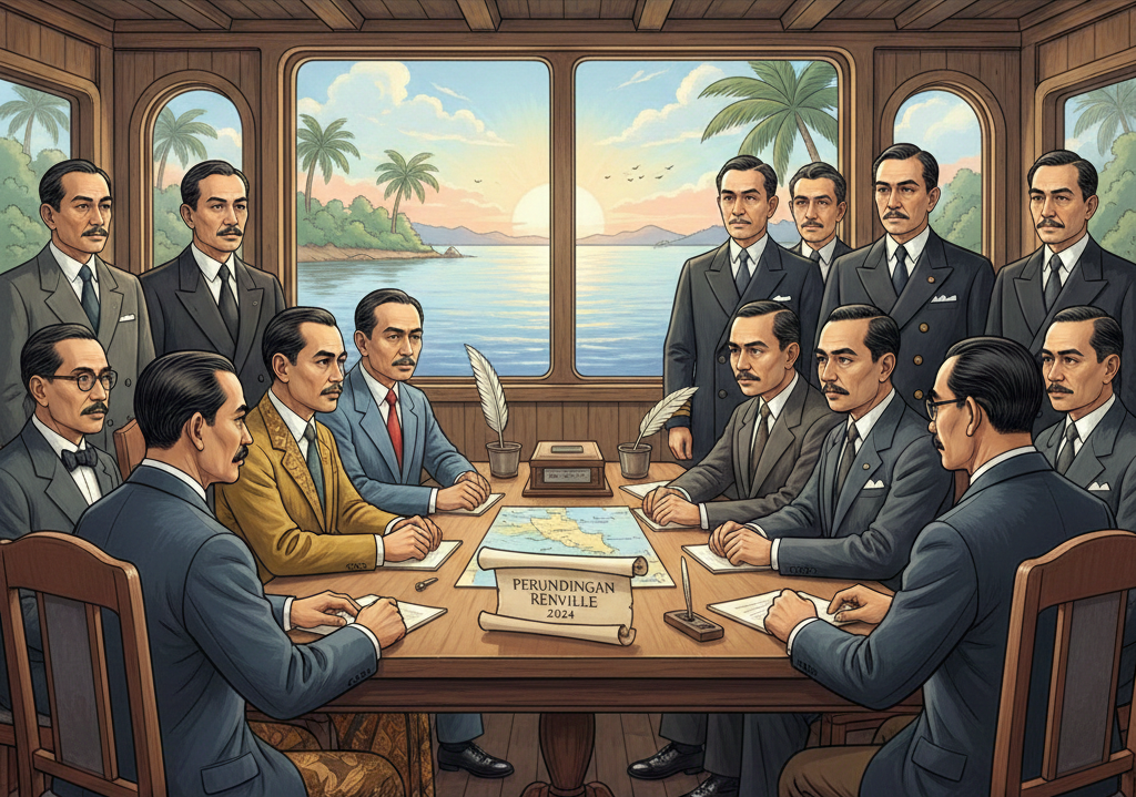 Perundingan Renville merupakan salah satu babak penting dalam perjuangan diplomasi Indonesia pasca-Proklamasi Kemerdekaan 17 Agustus 1945. Setelah Agresi Militer Belanda I (dikenal sebagai Operasi Produk) pada Juli hingga Agustus 1947, Belanda berhasil menduduki sebagian besar wilayah Republik Indonesia di Jawa dan Sumatera, termasuk daerah-daerah penghasil bahan pangan dan perkebunan strategis. Situasi ini membuat posisi Republik semakin terjepit, baik secara militer maupun ekonomi. Dewan Keamanan Perserikatan Bangsa-Bangsa (PBB) kemudian turun tangan dengan membentuk Komisi Tiga Negara (KTN) untuk memediasi konflik. Perundingan Renville dimulai pada 8 Desember 1947 dan berakhir dengan penandatanganan perjanjian pada 17 Januari 1948. Perundingan ini menjadi upaya diplomasi untuk menghentikan pertempuran, meskipun hasilnya sering dianggap merugikan Indonesia karena mengakui garis demarkasi yang mempersempit wilayah Republik. Namun, secara politik, perundingan ini memperkuat pengakuan internasional terhadap eksistensi Republik Indonesia sebagai pihak yang berdaulat dalam negosiasi.