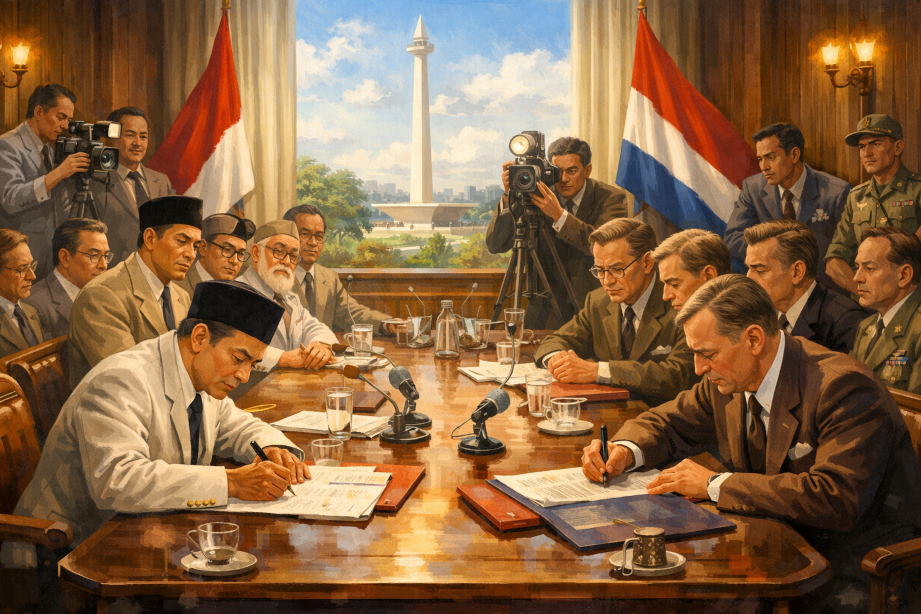 Ilustrasi delegasi Indonesia di meja perundingan Roem-Royen sebagai simbol kemenangan diplomasi.