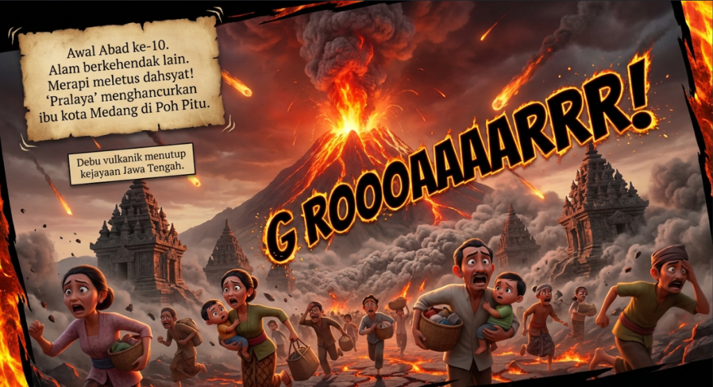 Selamat datang di lembaran sejarah visual yang akan membawa kita melintasi waktu menuju tanah Jawa di abad ke-8 hingga ke-10, era di mana Kerajaan Mataram Kuno (atau Kerajaan Medang) berdiri dengan kemegahan spiritual dan arsitekturnya yang abadi. Melalui komik ini, kita tidak hanya akan melihat perebutan takhta dan diplomasi politik antara Dinasti Sanjaya yang bercorak Hindu dan Dinasti Syailendra yang bercorak Buddha, tetapi juga menyelami keseharian rakyatnya yang agraris serta dedikasi luar biasa di balik pembangunan mahakarya dunia seperti Borobudur dan Prambanan. Bersiaplah menyaksikan harmoni di tengah keberagaman dan dinamika perpindahan pusat kekuasaan dari Jawa Tengah menuju Jawa Timur akibat amuk bencana alam, yang semuanya terjalin dalam narasi visual yang mendalam dan penuh makna.