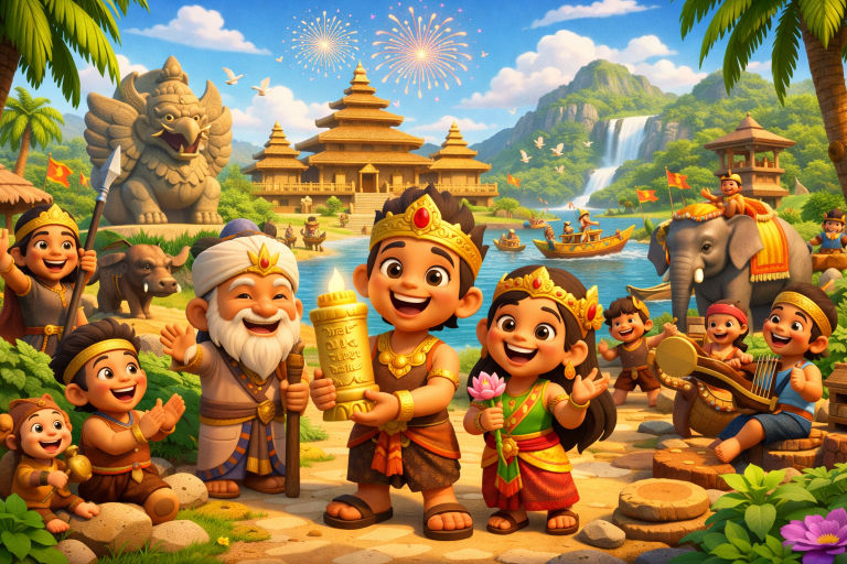 Selamat datang di era fajar peradaban Nusantara, di mana belantara Kalimantan Timur menjadi saksi berdirinya Kutai Martapura sebagai kerajaan Hindu tertua yang memancarkan cahaya aksara pertama melalui tujuh tiang Yupa. Melalui komik ini, kita akan melintasi lorong waktu menuju abad ke-4 Masehi untuk menyaksikan kearifan Maharaja Mulawarman dalam memimpin rakyatnya, meresapi akulturasi budaya yang sakral, serta memahami bagaimana fondasi spiritual dan sosial bangsa ini mulai dipahat di tepi Sungai Mahakam. Persiapkan diri Anda untuk menelusuri jejak-jejak sejarah yang autentik dalam balutan visual yang menghidupkan kembali kejayaan masa lalu yang sempat terkubur oleh waktu.