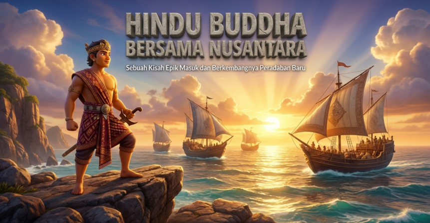 Selamat datang di lembaran visual yang akan membawa Anda mengarungi samudra luas, mengikuti jejak para pedagang dan pendeta dalam Proses Masuknya Hindu-Buddha ke Nusantara. Komik ini akan memvisualisasikan bagaimana angin muson membawa kapal-kapal bercadik dari India dan Tiongkok menuju pelabuhan-pelabuhan ramai di kepulauan Indonesia, memicu akulturasi budaya yang megah tanpa melalui penaklukan militer. Anda akan menyaksikan beragam teori sejarah—mulai dari peran kasta Brahmana yang membawa kitab suci, para Ksatria yang mencari perlindungan, hingga pedagang Waisya yang menjalin relasi ekonomi—semuanya melebur menjadi satu kekuatan budaya baru yang melahirkan kerajaan-kerajaan besar seperti Kutai, Tarumanegara, hingga Sriwijaya. Bersiaplah melihat bagaimana relief candi, aksara Pallawa, dan bahasa Sanskerta mulai bersemi, mengubah wajah peradaban Nusantara menjadi entitas yang penuh kemilau spiritualitas dan kejayaan maritim.